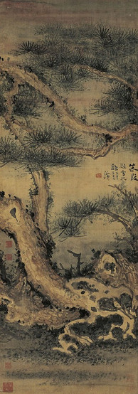 În gândirea chineză, pinul mereu verde și parfumat, deși poartă ramuri răsucite, ajunge până la cer cu trunchiul său drept și puternic, ca o persoană dreaptă, impregnată cu puterea și virtutea de a învinge toate adversitățile. În The Analectele lui Confucius (551-479 î.Hr.), este scris: „În timpul iernii, pinul și chiparosul sunt cunoscuți ca ultimii care se duc (歲寒,然後知松柏之後凋也).” În consecință, pinul a devenit considerat testul suprem al timpului, simbolizând un bătrân înțelept și curajos care a rezistat și a experimentat multe dificultăți. Prin urmare, în Înregistrările Marelui Istoric de Sima Qian (司馬遷, 145-86 î.Hr.), pinul era deja cunoscut drept „Unul dintre cei mai longevivi copaci (百木之長).”